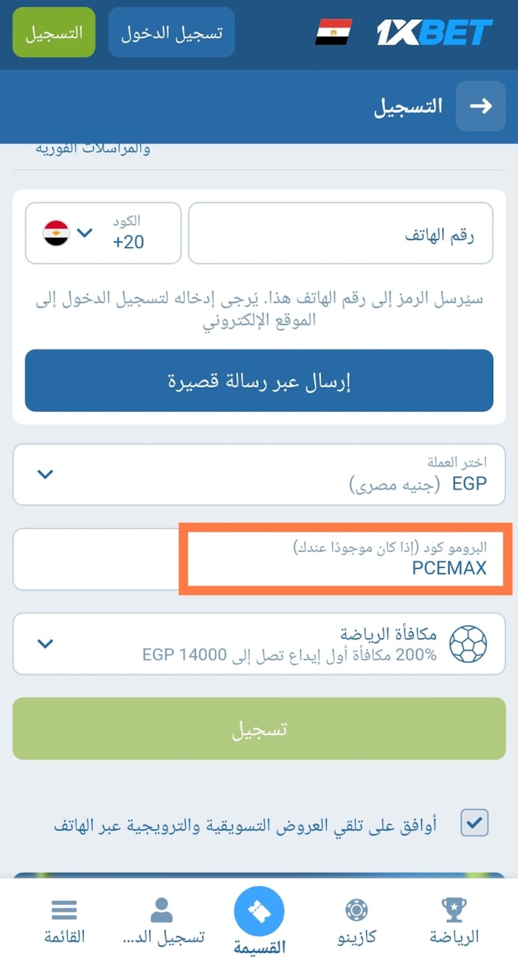 ادخل أقوى رمز ترويجي برومو كود 1xbet في مصر وهو PCEMAX في مرحلة التسجيل. يضمن لك الكود الحصول على مكافأة رهان مجاني تصل 18200 جنيه بدلا من 14000 جنيه.